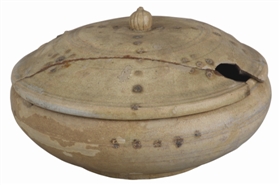 這件青釉點褐彩蓋盒,通高10.5、口徑16.5、底徑11.5厘米,上世紀(jì)50年代安徽省蕪湖市小桃園出土,現(xiàn)收藏于安徽博物院。蓋盒為直口,鼓腹,平底,盒蓋作子母口扣合,蓋鈕作寶珠式鈕。盒身與蓋面均刻劃數(shù)道弦紋,盒身中部一周有間隔的點褐彩斑點。蓋面飾兩條十字交叉的褐彩斑點帶,在蓋面四處對稱位置上又點飾中心一點、周圍六點的梅花狀褐彩圖案裝飾。蓋盒通體、內(nèi)外均施青釉,釉色青中泛黃,胎體灰白,胎釉結(jié)合不是很好,釉面開片及脫釉現(xiàn)象較明顯。