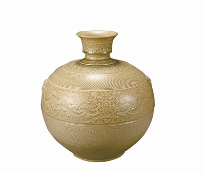 造型古樸是婺州窯的原始屬性,能給人一種樸素天然的感覺(jué)。它要求造型、釉色、裝飾三點(diǎn)要素必須和諧統(tǒng)一。“最古老的青瓷就是草木灰當(dāng)釉料的,而且代代相傳。”他說(shuō),“灰釉雖不如白瓷青瓷那么光鮮,但色澤沉穩(wěn),只要掌握火候還能生出包漿,這是其他釉色所不能具備的。”根據(jù)殘存的資料,經(jīng)過(guò)多年的實(shí)踐研究,確立草木灰釉的基調(diào)后,陳新華運(yùn)用跳刀、刻花、貼鋪首、堆塑成形等技法,整理開發(fā)了上百款婺窯器形,件件特色鮮明。