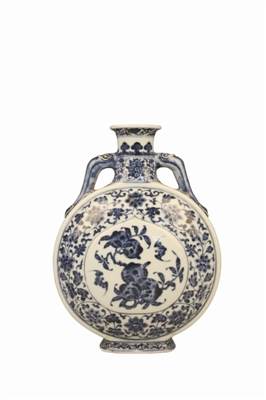 “福壽雙全”,由桃與蝙蝠組成。乾隆款青花綬帶蝠桃紋扁壺(圖2),高24.2、口徑5.6、底徑8.2×5.6厘米。撇口,短頸,扁腹,圈足,足內(nèi)有“大清乾隆年制”三行六字篆書款。綬帶式如意形耳,腹部兩面開光,內(nèi)繪蝙蝠、折枝桃紋,組成福壽雙全圖案,周圍繪纏枝花卉,圈足部繪卷草紋。桃是高壽的象征。漢代東方朔的《神異經(jīng)》中有:“食之(桃)益壽”!短接[》卷九六七引《神農(nóng)經(jīng)》:“玉桃服之,長生不死。”這是桃與長壽聯(lián)系在一起的文獻史料。人們將桃子稱為壽桃,是長壽的象征。桃與蝙蝠相結(jié)合象征“福壽”,故此又稱福壽雙全。