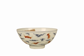 “洪福齊天”,多只紅蝠與祥云組合。雍正款洪福齊天紋碗(圖5),高4、口徑9.7、底徑3厘米?谖⒊ǎψ,足內(nèi)有“大清雍正年制”雙行楷書款。器腹上繪滿天飛舞的紅蝙蝠,間以云朵紋。以紅色的蝙蝠諧音“洪福”,蝙蝠飛行于云朵間,象征洪福之高與天等齊,故稱洪福齊天。