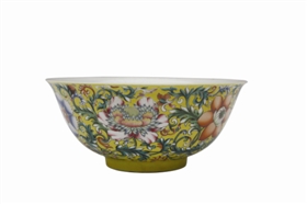 “五福”,以五只蝙蝠裝飾于盤碗內(nèi)底或外壁。乾隆款黃地百花蝙蝠紋碗(圖3),高8、口徑18.5、足徑7.5厘米。敞口,下腹內(nèi)收,圈足,足內(nèi)有“大清乾隆年制”三行篆書款。碗外壁腹部繪百花紋與蝙蝠,內(nèi)底為五蝠紋(圖4)。“五蝠”諧音“五福”。