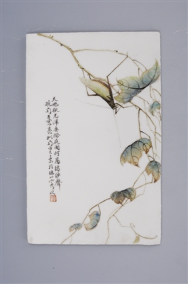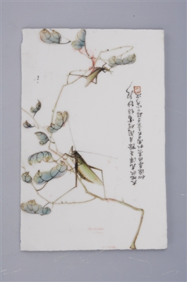 民國(guó)李明亮款粉彩蟲(chóng)草畫(huà)插屏(圖1),縱20、橫12.6、厚0.3厘米,長(zhǎng)方形單面瓷板畫(huà)插屏。正面施白釉,彩繪一條青藤和一只蚱蜢。左邊有行書(shū)題款:“大地秋光渾無(wú)際,夜闌何處紡紗聲”“皖南李明亮擬南田意于珠山客次”。