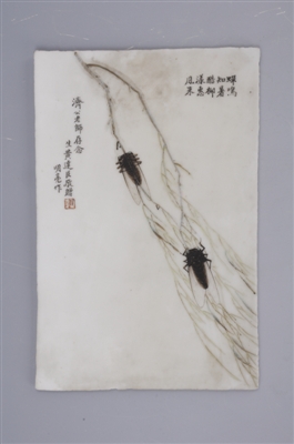 這4件瓷板畫(huà),題材均為粉彩蟲(chóng)草,以雙勾填彩之法,用工細(xì)清麗的筆墨在瓷面上表現(xiàn)蟲(chóng)棲飛草之態(tài),不但清新雅致,而且所繪蟲(chóng)草形態(tài)逼真。
