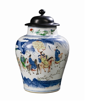 此罐(見圖)高33厘米,胎體厚重,圓唇直口,直頸,豐肩,鼓腹,平底無(wú)釉。胎質(zhì)細(xì)密堅(jiān)硬,釉面肥潤(rùn)而略顯青色。通體以青花五彩裝飾,人物繪畫細(xì)膩,神態(tài)各異;人物勾線、設(shè)色,以及山石樹木的布局和勾畫皴染等,具有典型的清早期風(fēng)格,為早期的民窯作品。