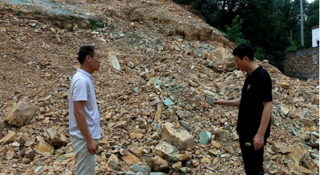 郭廣現(xiàn)(圖左白衣)與汝瓷口述歷史檔案的師生在蔣姑山上探尋父親郭遂發(fā)現(xiàn)的礦石所在地