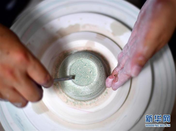 在河南省焦作市修武縣當(dāng)陽峪村,絞胎瓷藝人在車間內(nèi)制作絞胎瓷坯體。