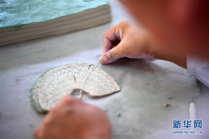 在河南省焦作市修武縣當(dāng)陽峪村,“當(dāng)陽峪絞胎瓷燒制技藝”國家級(jí)代表性傳承人柴戰(zhàn)柱在“編織”絞胎瓷的羽毛紋圖案。