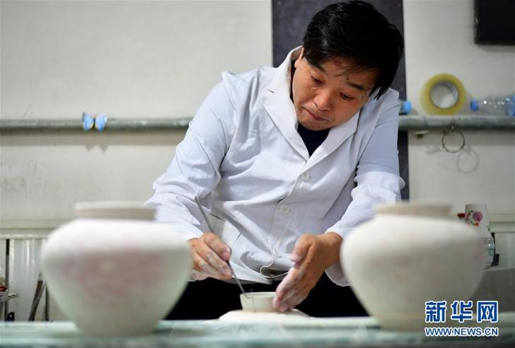 在河南省焦作市修武縣當(dāng)陽峪村,“當(dāng)陽峪絞胎瓷燒制技藝”國家級(jí)代表性傳承人柴戰(zhàn)柱在調(diào)整“編織”好的絞胎瓷菊花紋。