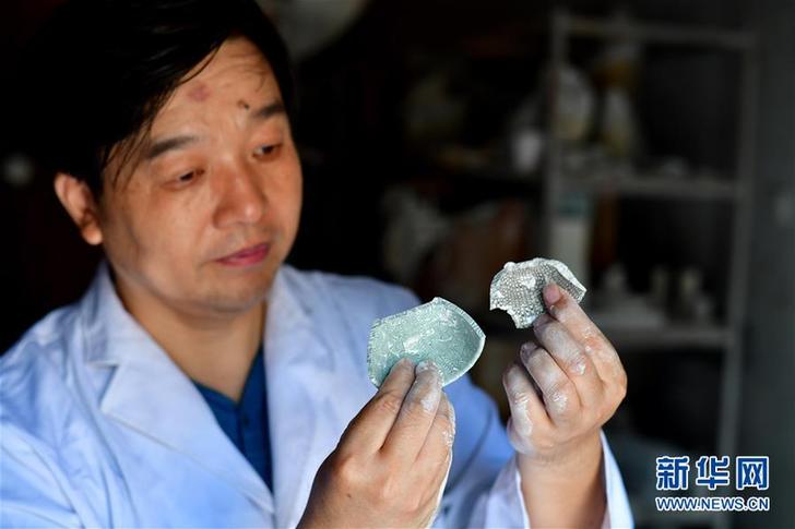 在河南省焦作市修武縣當(dāng)陽峪村,“當(dāng)陽峪絞胎瓷燒制技藝”國家級(jí)代表性傳承人柴戰(zhàn)柱在查看絞胎瓷瓷片的紋路。
