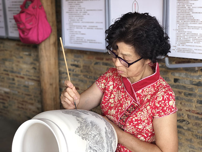 8月30日早上9點,66歲的省級非物質(zhì)文化遺產(chǎn)傳承人袁寧霞準時來到珠山區(qū)徐家柴窯,她今天的主要任務是在陶瓷坯體上描繪紋飾并繪上山水畫,這一描就是一整天。