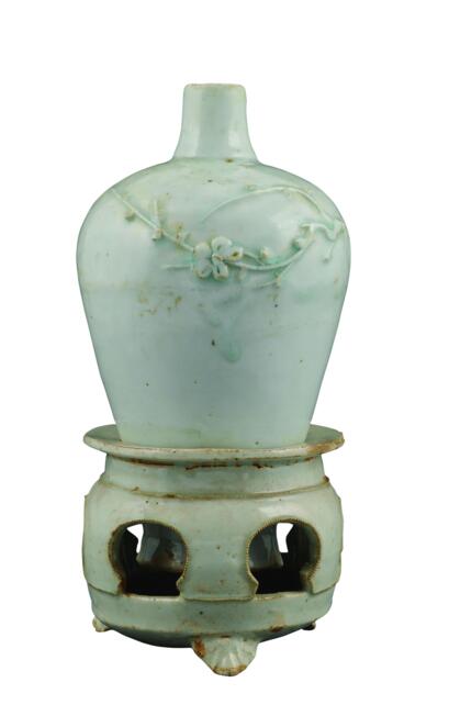 此件梅瓶雖然施青白釉,但也算得上是一件精品。宋代景德鎮(zhèn)就創(chuàng)燒成功青白瓷,青中有白,白中顯青,“佳者瑩縝如玉”,代表了南方青白瓷系的最高水平。當時景德鎮(zhèn)的青白瓷燒制水平最高,產(chǎn)量最大,“工匠來八方,器成天下走”。青白瓷裝飾以印花、刻花為主,還有貼花等技法。此器就用了堆塑梅花技法。