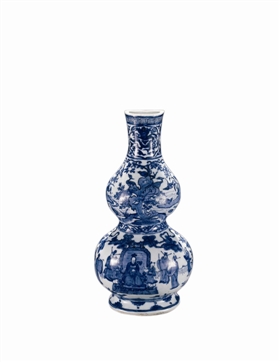 該器體積龐大,是壁瓶中的佼佼者。通體以青花為飾,青花發(fā)色藍(lán)艷,層次分明,畫(huà)面布局飽滿?谙嘛椧恢芑刈旨y。頸部開(kāi)光,繪團(tuán)龍紋。上腹部,繪青花太湖石、樹(shù)木花草。下腹部繪人物。畫(huà)面中間一人,端坐高背椅上,手執(zhí)靈芝,頭戴發(fā)冠,道骨仙風(fēng)。四周站滿了著官服的人。畫(huà)面似乎是在描繪明朝“道君皇帝”嘉靖帝的故事。