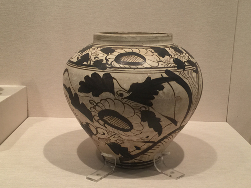 “白釉黑花罐”更能展現(xiàn)元代磁州窯瓷器的典型特征,“出土于濟南陳家莊的‘白釉黑花罐’通體白底上裝飾黑色花紋,肩及腹部用黑彩畫上了纏枝菊花,花紋黑白對比強烈。”徐波說。