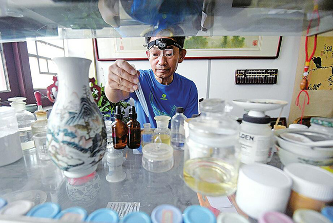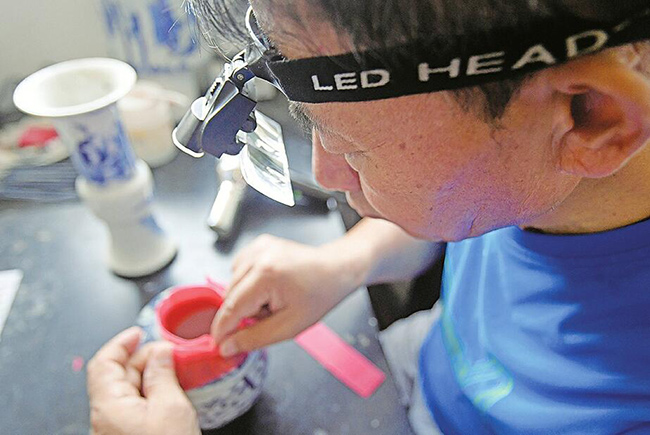 修復(fù)瓷器前,王春發(fā)都要與它認(rèn)真對話,仔細(xì)觀察。