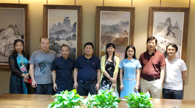 中宇力度文化有限公司董事長(zhǎng)、中國(guó)知名相聲演員卓林等一行與景德鎮(zhèn)景東陶瓷集團(tuán)有限公司董事長(zhǎng)張曉東在張茂松陶瓷研究院內(nèi)合影