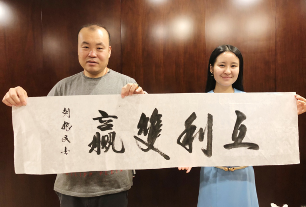 中宇力度文化有限公司董事長(zhǎng)贈(zèng)送景德鎮(zhèn)景東陶瓷集團(tuán)有限公司運(yùn)營(yíng)總監(jiān)萬娜由全國(guó)政協(xié)常委、中宣部原副部長(zhǎng)胡振民所題的《互利雙贏》題字