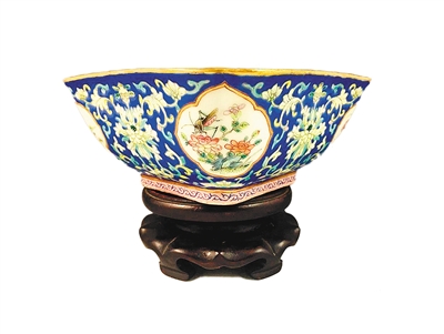 蟲草紋細路粉彩碗。這是一只產(chǎn)于清代的細路粉彩碗,碗口呈倭角狀,藍地,四面有開窗。碗口每邊長17.5厘米,高13.4厘米,周身有纏枝紋,藤蔓纏繞,莖葉茂盛,花朵碩大而嬌艷,充滿生機。開窗之內(nèi),繪有蟲草紋,只見蘭花幽香,菊花傲霜,月季嬌美,牡丹富貴,仿佛能嗅到這些鮮花的芳香。各有一只秋蟲爬行于花朵上,它們或為蟋蟀,或為蝗蟲,或為飛蛾,或為蟈蟈,有的振翅欲飛,有的快速行走,有的短暫停留,有的流連忘返,靈動跳躍,宛如精靈。