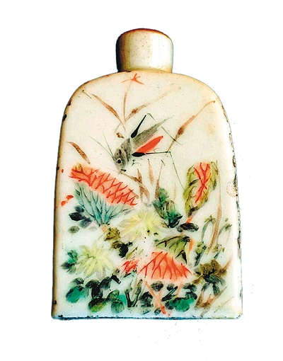 蟲草紋淺絳彩鼻煙壺。這是一只產(chǎn)于民國時期的淺絳彩鼻煙壺,它直口、削肩,分四面,底為四邊形,口徑1.5厘米,高6.5厘米,底部長4.7厘米,寬2.9厘米。在較寬的兩面上,分別有圖案和題款,圖案為菊花秋蟲圖。只見菊花葉子肥大而茂盛,花朵碩大而鮮艷,遠處有蘆葦草葉,其上有一只秋蟲,正趴在草葉上,貪婪地吮吸著上面的露水或草汁,題款為“太平有象題字”。較窄的兩面沒有圖案或題字,邊緣處有所磨損。