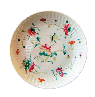 蟲草紋粉彩賞盤。這是一只產(chǎn)于清代同治年間的粉彩賞盤,為圓形,內(nèi)為凸凹相間、組成菊瓣紋的白底。它的口徑為22.5厘米,高4.6厘米。由于盤口較大,圖案較美,為觀賞盤無疑。在盤子的表面,便是花卉和蟲子組成的美麗圖景,只見海棠花開,并從旁邊伸出一枝,一直伸向遠方。邊緣四枝海棠,布滿整個盤子,中心的一枝較大,顏色鮮艷。其上正有一只秋蟲,長長的觸須擺在后面,它昂著頭,翹著腿,好像正在昂首闊步向海棠花邁進,急不可耐想一親它的芳澤。在盤子的外表面,有分布四面的蝙蝠紋,在底部有篆文“大清同治年制”底款。