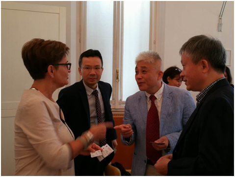 宏宇集團(tuán)市場(chǎng)總監(jiān)王勇(右二)與意大利陶瓷中心主任Maria Chiara Bignozzi博士(左一)溝通交流