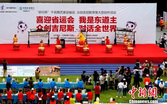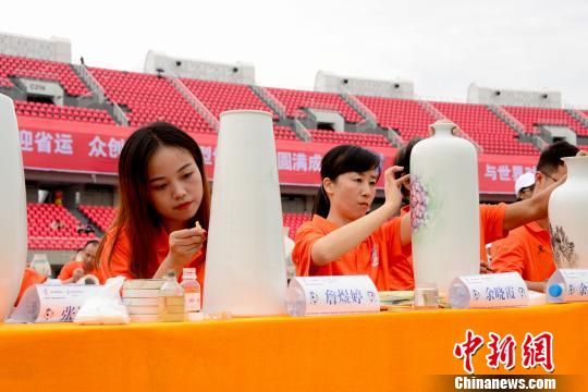 當(dāng)天下午,“千名陶藝家迎省運眾創(chuàng)吉尼斯榮譽大型創(chuàng)作活動”在江西省第十五屆運動會主場館景德鎮(zhèn)市體育中心體育場內(nèi)上演。綠茵場上,千余名陶藝家分散排開,正身端坐,筆蘸丹青,在白胎瓷瓶上揮毫創(chuàng)作,繪以青花、粉彩,花鳥、山水等題材,盡情展現(xiàn)千年瓷都藝術(shù)風(fēng)采。