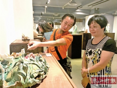 在展覽中,廣東省陶瓷藝術(shù)大師吳植華向同行介紹其作品《荷塘清韻》。
