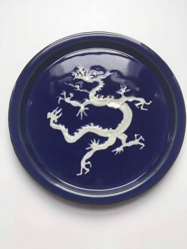 此盤折沿,淺壁,平底。通體內外施藍釉,外底無釉。盤心坦平,在藍釉地上以白色泥料塑貼一條矯健的白龍。龍細頸,三爪,作昂首翻騰狀。它是先在素胎上刻劃龍的輪廓和龍鱗;再在龍紋上直到緊邊緣處施乳白釉,并用青花輕輕點出龍的眼睛;然后在紋飾輪廓線外的全部地方施藍釉作地。