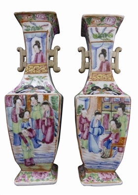 廣彩瓷畫大多以描繪古代詩意而見出高下。如圖所示這對方瓶所飾的辭行場景,出自于清代黃景仁的《別老母》:“搴帷拜母河梁去,白發(fā)愁看淚眼枯。慘慘柴門風(fēng)雪夜,此時有子不如無。”故事主人公因為要去河梁謀生,所以把帷帳撩起,依依不舍要向年邁的母親辭別,看到白發(fā)老母不由淚下。在這風(fēng)雪之夜,不能在母親身邊盡孝,卻要掩柴門凄慘地遠去,不禁令人興嘆:養(yǎng)子又有何用呢?原本有點凄慘的詩意,卻被畫工裝飾得殷實富麗,看出寄托著工匠美好的情感。