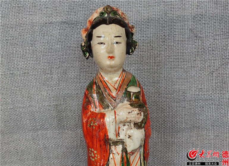 “德州窯出土的紅綠彩瓷器是我國陶瓷藝術中色彩濃艷、風格鮮明,極具民間特色的彩瓷”,德州職業(yè)技術學院副教授、紅綠彩陶瓷畫師霍云芳介紹說,燒制方法是在高溫燒成的白釉器上用紅、綠為主等彩料勾畫紋飾,再入窯800 ℃低溫燒制的釉上彩繪瓷器。因此也常被 稱為“宋加彩”或“金加彩”。主色為紅、綠、黃三色為主 , 色彩對比強烈。裝飾紋樣以花枝、云紋等紋樣居多,局部施紅彩,并有濃淡之分。整體裝飾以紅彩勾勒為主,填涂為輔,線條流暢舒展,有艷麗明艷之感。德州窯的紅綠彩瓷加入黑色居多,人物俑五官衣紋均是黑色描出,衣服施紅、綠色塊;日用器皿主有有碗、盤、罐、瓶、紅綠彩縛捆嬰兒與摩睺羅、人物俑等,反映出北方人民的生活特征,具有鮮明的地域特色。