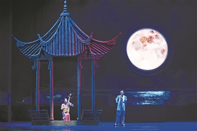 這臺晚會匯聚了諸多粵港澳地區(qū)最具代表性的民間藝術(shù)和傳統(tǒng)文化。開場舞蹈《鼓舞嶺南》就以廣東代表性的高樁醒獅、英歌、錢鼓等民間藝術(shù)形式融合廣東音樂,展示了嶺南人勇于創(chuàng)新、追趕潮頭的情景。民樂演奏大咖繆曉錚、譚炎健的琵琶與簫合奏《彩云追月》則用民樂與多媒體影像結(jié)合的方式呈現(xiàn)出夢幻般的優(yōu)美畫卷。廣東歌舞劇院創(chuàng)編的舞蹈《青花瓷韻》試圖在中國舞的呼吸身法、典型動作中勾畫出古老青花瓷器的神韻。