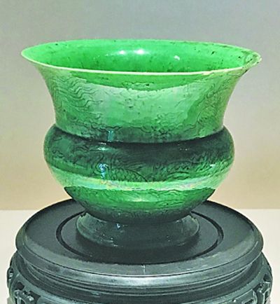 萬(wàn)歷御窯單色釉瓷器存世量較少,既有低溫釉系的澆黃釉、茄皮紫釉瓷,也有高溫釉系的祭藍(lán)釉瓷,器物造型和制作工藝均沿襲嘉靖、隆慶朝御窯單色釉瓷傳統(tǒng)。近觀《瓜皮綠釉錐拱云鳳紋渣斗》,器物造型端正、釉色純正,若隱若現(xiàn)的鳳紋雖刻于堅(jiān)硬的瓷質(zhì)器身,卻柔美飄逸,呼之欲出,每根線條的排布都精心設(shè)計(jì),繁而不亂,制作難度之大可見(jiàn)一斑。