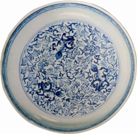 首先,是背景中的纏枝蓮圖案。纏枝蓮紋是我國傳統(tǒng)瓷器裝飾紋樣之一,明清時(shí)期尤為盛行。因其圖案花枝纏轉(zhuǎn)不斷而得名,明代稱為“轉(zhuǎn)枝”。它的特點(diǎn)是以波狀線與切圓線相組合,形成波卷纏綿的基本樣式,再在空間中或波線上綴以花卉。并點(diǎn)以葉子,便形成枝莖纏繞、花繁葉茂的纏枝花莖紋或纏枝花果紋,它的寓意是富貴纏身。