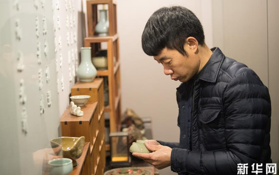 1月16日,陳衛(wèi)武在“宋韻”展廳查看一件龍泉窯古器物。他收藏了一些古器物和殘片,作為創(chuàng)作的參照。 青瓷藝人陳衛(wèi)武,1973年生于浙江龍泉,一家三代均為國營瓷廠工人。瓷廠改制后,他難舍對青瓷的熱愛,前往更為古老的青瓷故鄉(xiāng)慈溪,對越窯青瓷進行了6年的研習(xí)。 2007年,陳衛(wèi)武重回龍泉,成立“宋韻”工作室,創(chuàng)作沿襲青瓷脈絡(luò)、符合當(dāng)代審美的文房、茶、花器具,作品獲得越來越多人的推崇。 “要走在前面,做出人家沒有的東西,得保持心里的簡單和敏感。”陳衛(wèi)武說。