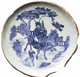 這塊清代乾隆時期瓷片(見圖)叫“托塔天王”,畫工非常好,發(fā)色典雅深沉,人物、樹石、麒麟、景深,無一不是真實場景的畫意再現(xiàn)。它是南京古玩城一位瓷友收藏的,直徑在17厘米,瓷厚0.6厘米,有些分量,可以算瓷片中的“大件”了。古陶瓷專家葉伯瑜說,乾隆時期青花器多仿明永樂、宣德的蘇麻離青,但沒有進口料,以筆端點染鐵銹斑痕。其次是仿成化的淡描青花。此瓷片色澤可見一斑。