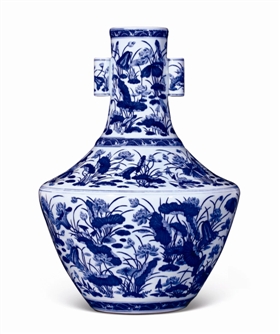 清乾隆 青花蓮池清趣圖折肩大貫耳壺