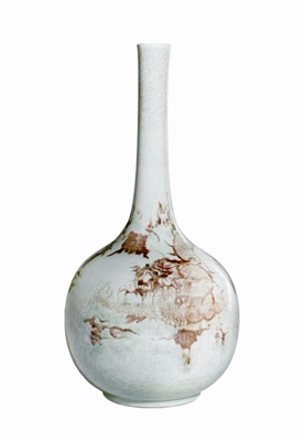 圖1所示這件清雍正釉里紅龍紋油錘瓶,高42.5、口徑4、足徑11厘米,通體飾淡青釉,頸口及器身局部釉面有細(xì)開片,釉色瑩潤。腹部以釉里紅描繪一四爪蛟龍,周圍飾以云氣及火焰,圖案充滿動勢。主體圖案之外,器身無過多裝飾,簡練明快,整體配色柔和。圈足刮釉露胎,外底白釉無款。油錘瓶是瓶的一種式樣。器型大多小口,細(xì)長頸,圓腹,圈足,形似榨油作坊用的油錘,故名。這件雍正朝釉里紅油錘瓶發(fā)色純正,品相極佳,現(xiàn)收藏在清華大學(xué)藝術(shù)博物館。