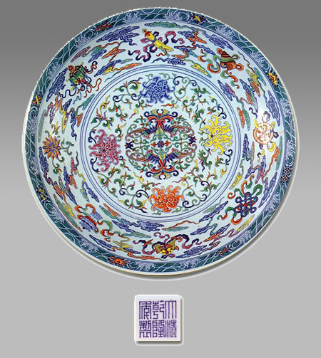紋飾繁密,色彩艷麗,盤心由內(nèi)向外分別繪有雙鳳穿花、纏枝牡丹、祥云托八寶、海水雜寶紋等。