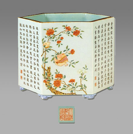 筆筒為六方形, 口沿描金,外壁六個面上分別繪有粉彩石榴、山茶、菊花并題寫行書《詠石榴》、隸書《詠山茶》、篆書《詠菊花》詩三首,均為皇帝親筆御書。石榴、山茶、菊花均是秋季花實,合稱“三秋”圖。