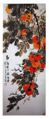 圖1,《紅柿圖》,紙本,彩繪。縱162、橫45厘米。圖繪兩枝累累紅柿,瑪瑙般成串熟透的大柿子把枝頭壓彎,從上直到下方。在左側中下方落款:“紅在心頭甜到老。一九五八年春月,星五畫。”下鈐紅文印“星五”,右下角還鈐一方白文收藏印。
