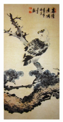 圖2,《高瞻遠矚圖》,紙本,淡彩。縱160、橫46厘米。畫一只蒼鷹棲息在枯松枝上,作回頭顧盼同伴飛來。右上方落款:“高瞻遠矚。壬戌年秋月,星五畫。”下鈐紅文印“崔氏”“星五”。壬戌年,即民國十一年(1922)。