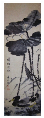 圖4,《荷塘清和圖》,紙本,墨筆?v163、橫39厘米。上方被三面田田的荷葉占滿,一枝盛開的荷花躲在荷葉間,一枝花苞在右側荷葉下;下方一只野鴨在荷塘暢游。左側下方落款:“荷塘清和。星五畫。”下鈐紅文印“崔氏”“星五”。