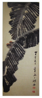 圖5,《芭蕉圖》,紙本,墨筆。縱162厘米,橫39厘米。兩片碩大的蕉葉幾乎布滿整個畫面,具有很大的氣勢。右側下方落款:“甲子年夏月,星五畫于湖西。”下鈐紅文印“星五”、白文印“星五之印”。甲子年,即1984年;湖西,即指微山湖西的單縣,解放戰(zhàn)爭期間曾設“湖西邊區(qū)”,其治所在單縣。
