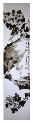 圖6-4,巖菊屏,中部突兀的大山巖占了大半畫面,其上一欄盛開的菊花,山巖下從右伸出一枝盛開的菊花,上下呼應,很有神氣。右側中部巖石上落款:“蕭條報雨過重陽,石角懷秋臥晚涼。星五畫。”下鈐紅文印“星五”、白文印“崔氏”。