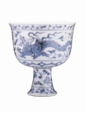 明代洪武時(shí)期高足碗,一反元代碗形較淺、高足較高的形制,轉(zhuǎn)變?yōu)槠魃磔^深、高足略短的新造型,之后永樂(lè)、宣德繼之。臺(tái)北故宮博物院藏有洪武及器心帶“永樂(lè)年制”四字篆印款、相同形制的甜白釉高足碗。此器口、足的纏枝靈芝紋,及高足上的纏枝蓮紋,均先勾繪花朵輪廓線,花瓣邊緣及花心留白,內(nèi)層染青,此一特殊描繪技法為洪武青花、釉里紅紋飾的獨(dú)有特征。而帶翼三爪應(yīng)龍紋飾殊為特別,龍身魚(yú)尾,與一般所見(jiàn)洪武細(xì)身龍紋有所不同。此器的形制、灰青釉色,以及花邊留白的特征,都呈現(xiàn)出洪武青花的特色。目前為止,傳世或者御窯遺址出土均無(wú)發(fā)現(xiàn),極為珍稀。