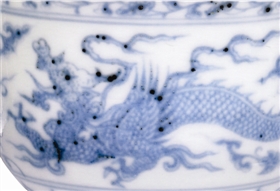 臺(tái)北故宮博物院收藏有一件明洪武青花穿蓮應(yīng)龍紋高足碗,非常罕見(jiàn),根據(jù)推測(cè)應(yīng)當(dāng)為目前僅見(jiàn)的孤品。其高12.6、口徑11.5、足徑5.2厘米。撇口,深弧壁,高足。外壁口足青花各繪轉(zhuǎn)枝靈芝紋一周,碗壁主紋畫三爪穿蓮帶翼龍紋一對(duì),底邊飾雙層蓮瓣紋,高足為纏枝蓮紋。碗壁胎骨勻薄,足稍厚,青花釉色灰青,深淺不均,多處呈現(xiàn)黑疵斑點(diǎn),白釉潔白泛灰,底白胎堅(jiān)細(xì),胎釉一線呈淺黃色。