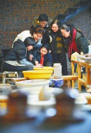 市民在體驗陶藝創(chuàng)作的樂趣。