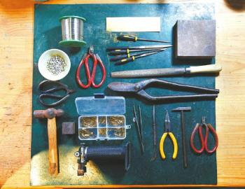 鋦瓷工藝中會用到弧鉤刀、短嘴剪、鑷子、小榔頭、尖嘴鉗等上百種工具。