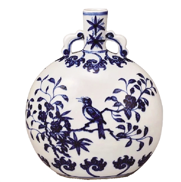 據(jù)《清檔》記載,雍正帝曾不止一次遣送清宮所藏瓷珍至景德鎮(zhèn)以資效仿,為了達(dá)到與永樂時期一致,通常無款,而后乾隆時期,產(chǎn)量劇增,而且都落乾隆款識。東京中央這件抱月瓶,便是雍正皇帝仿永樂青花抱月瓶中的經(jīng)典之作。腹部兩面各繪一喜鵲立于梅枝,一只抬頭翹首相望,另一只則微微俯視。繪畫生動,寓意“喜上眉梢”,故將其稱之為“一只鳥”。