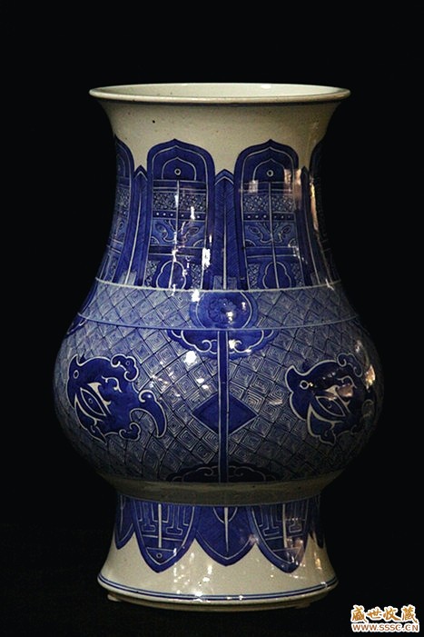 仿古銅器尊燒造。敞口,粗頸,鼓腹,撇足。通體青花紋飾多組,突出頸部的變形焦葉紋和腹部回字錦地紋上所繪的仿銅器夔紋,足部繪倒蓮紋交錯古代青銅器紋。底部白釉上有雙圈款。
