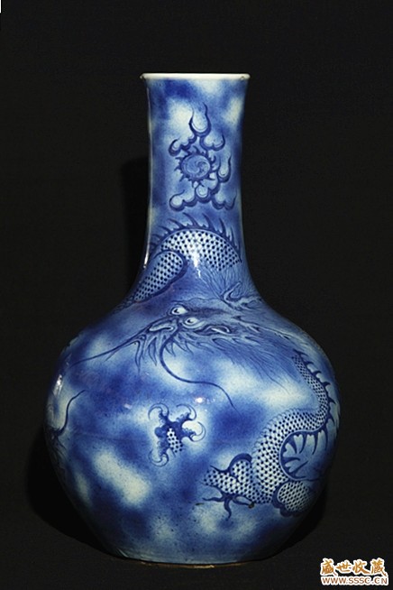 天球瓶,通體以吹釉法加以青花繪兩條四爪龍表達(dá)龍穿云間的主題。所繪龍紋顯得怒發(fā)沖冠,飛騰有力。底足臍內(nèi)青花楷書“大清乾隆年制”底款。